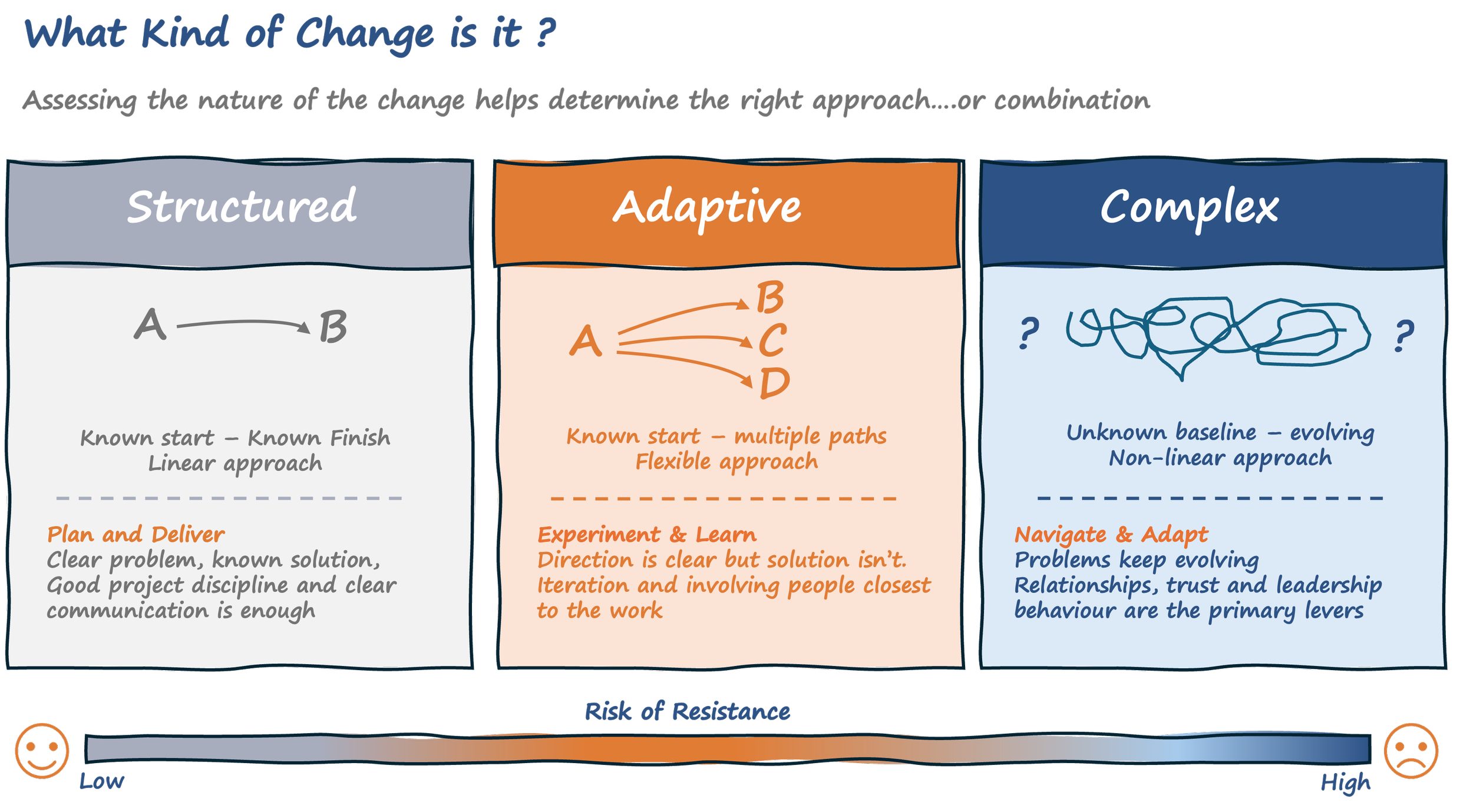 At one end of the spectrum sits structured change. The problem is clear, the solution is known, and implementation can be planned and managed. Good project discipline, clear communication and competent execution will get you a long way here. This is where traditional change management is at its best.